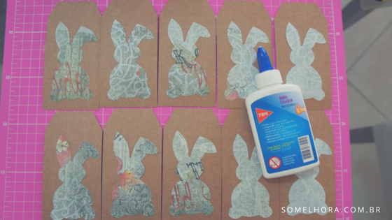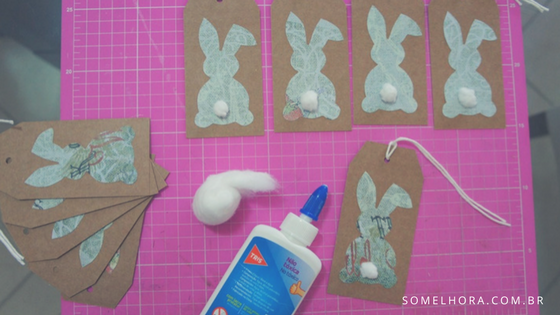 Depois de recortados, é só colar seus coelhos nas bases das tags. Como não estamos trabalhando com fotografia, pode-se usar cola branca normal.