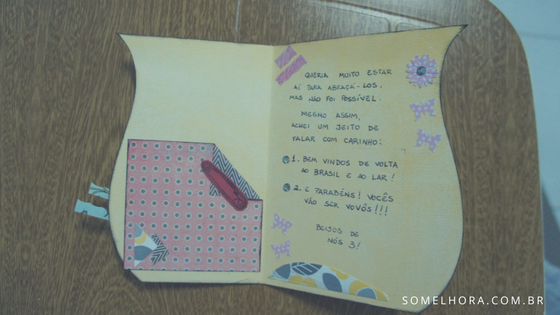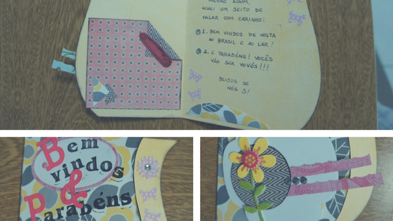 No interior do cartão fiz um bolso, onde coloquei o exame de laboratório com o positivo dobrado. E contei o motivo pelo qual eu estava os parabenizando: eles seriam vovôs! Depois foi só esperar pelo telefonema da minha mãe, chorando, claro! É muita emoção num cartão só, né?