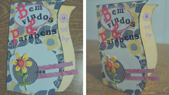 Utilizei um papel de scrap dupla face para a base. Assim, tinha o lado de fora do cartão com fundo decorado e a parte interna amarela lisa – o que me permitia escrever direto nele (contando da gravidez por texto).