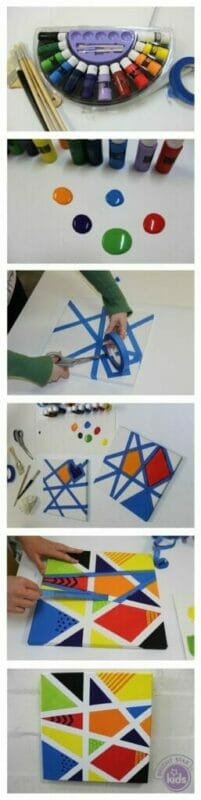 Vamos começar com o tradicional: um quadro de canva pintado com tintas. Só que a ideia aqui é usar uma fita adesiva para limitar as cores. Não fica incrível o resultado?