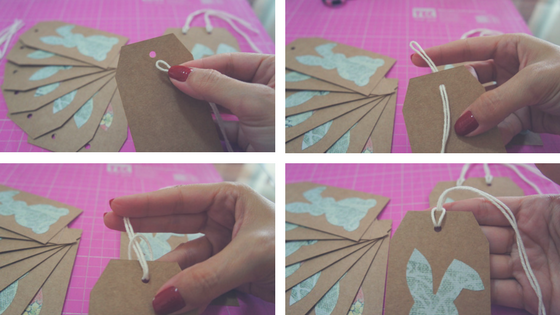Cortei bartantes de aproximadamente 30 cm. Eu dobro o barbante no meio e passo pelo furo pelo verso do cartão. Depois de puxar o barbante quase até o final, passo dentro da alcinha que ele mesmo formou.